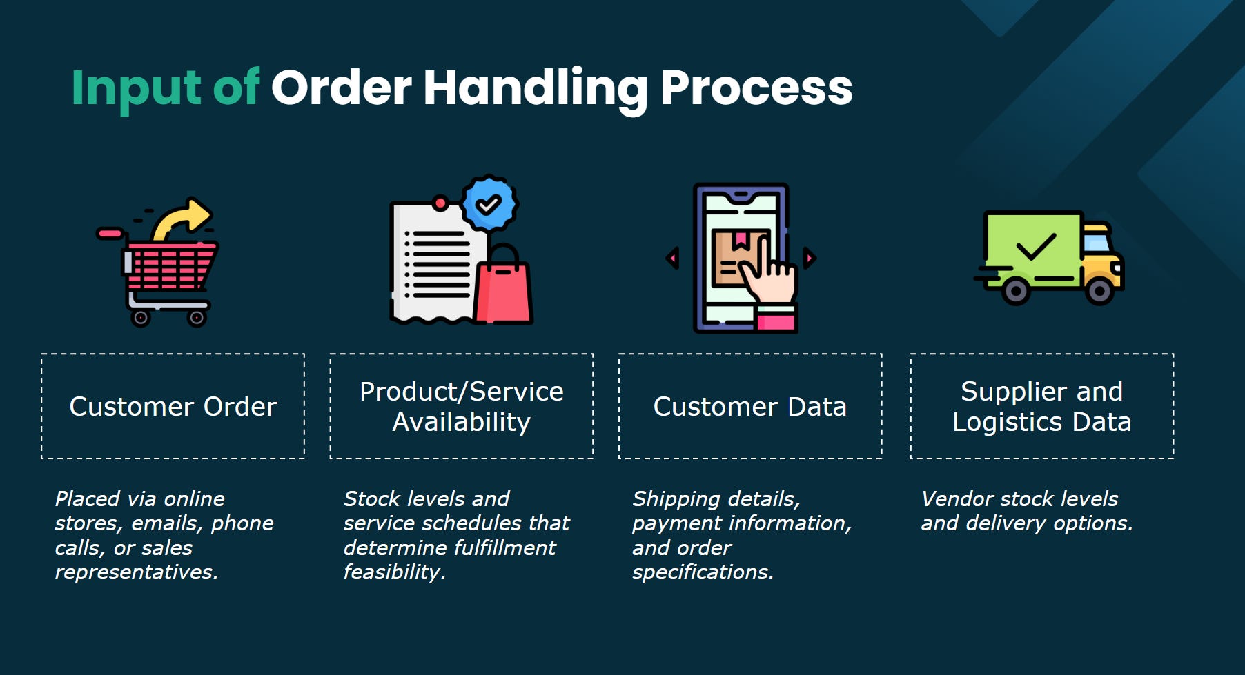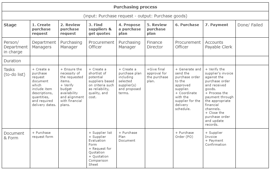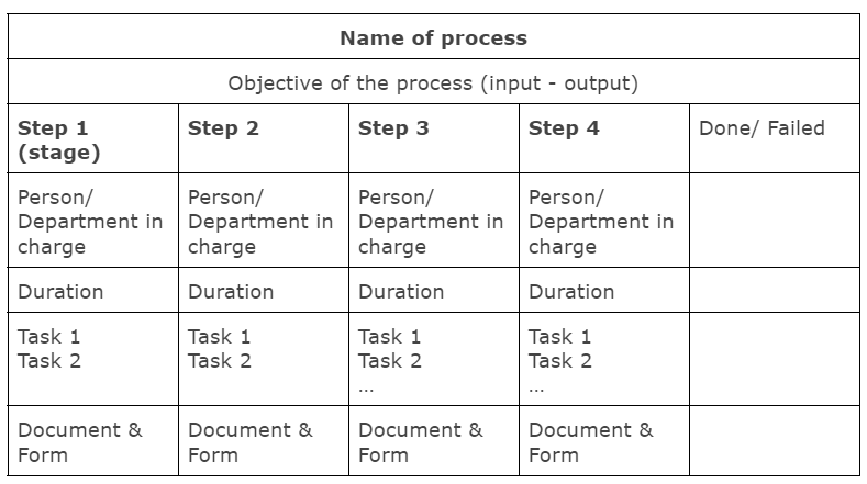 Input and Output: Determine the starting point and required information or objects. Identify when and where the process concludes and what outputs, such as information or products, are generated. For instance, in a sales process, the input is customer interest, and the output is a closed sale. In a recruitment process, the input is interested candidates, and the output is a hired employee.