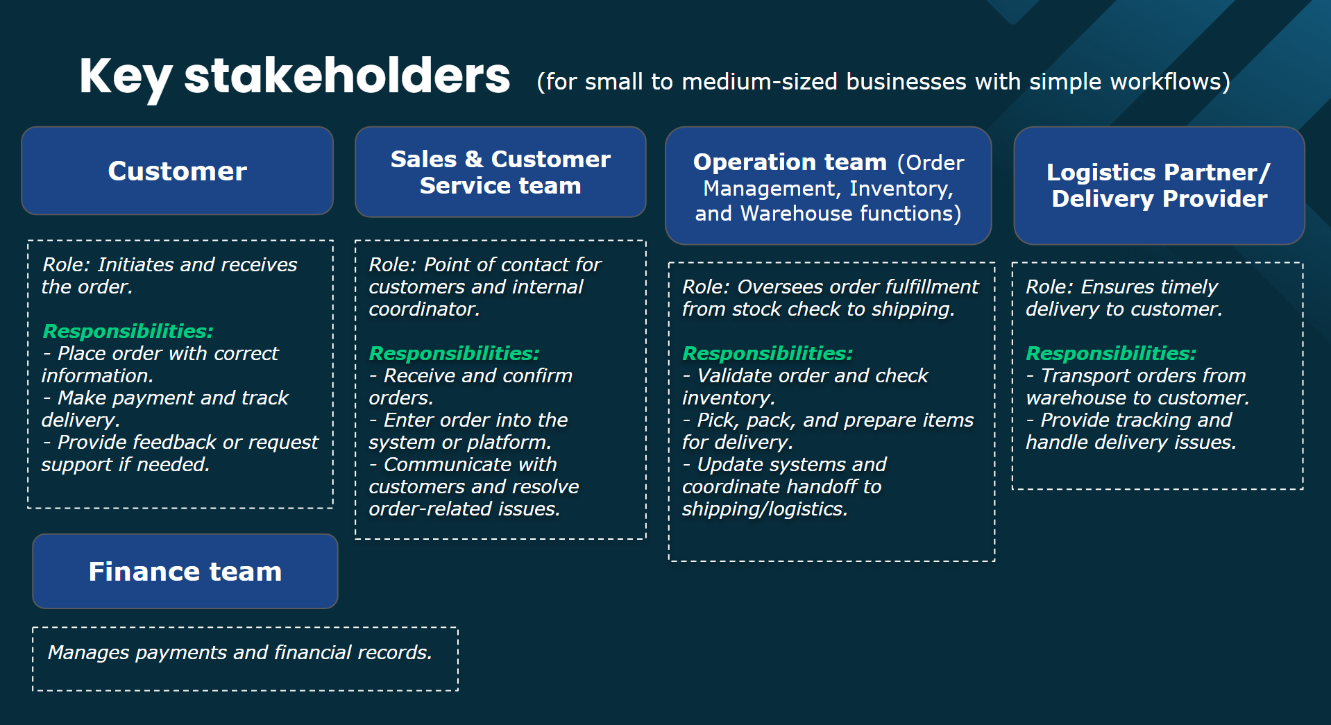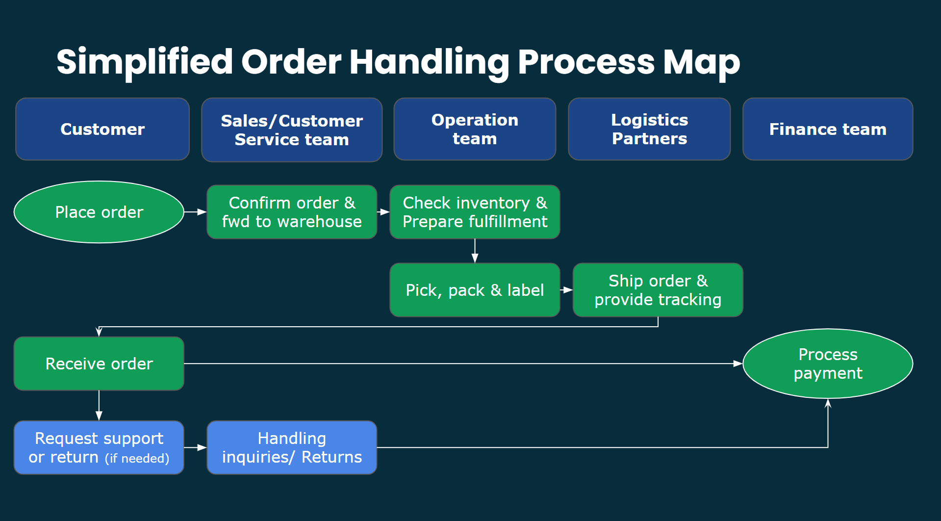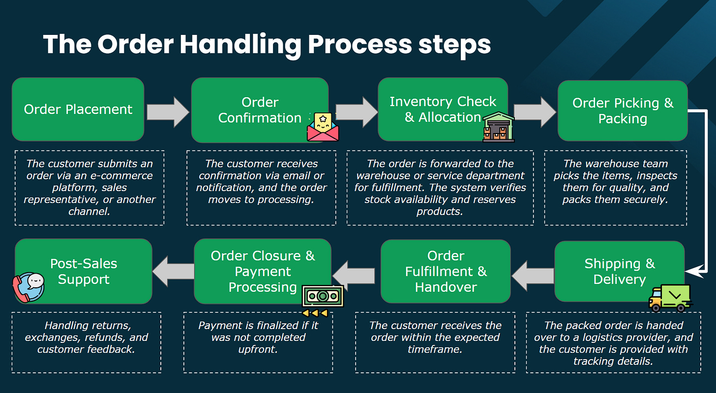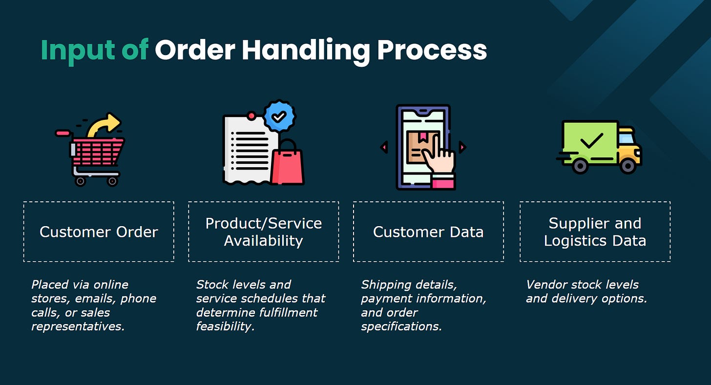 As another example, I’ll walk you through designing an Order Handling Process using the key components mentioned above - Inputs & Outputs, PICs, Stages & To-dos. In a real operation, you'll also need to define stage durations, stage custom fields and assignment methods between stages.