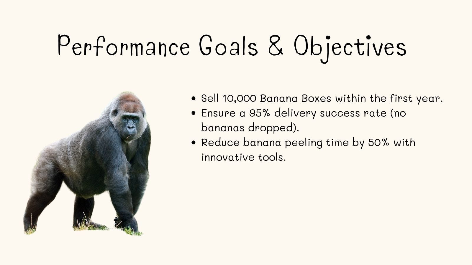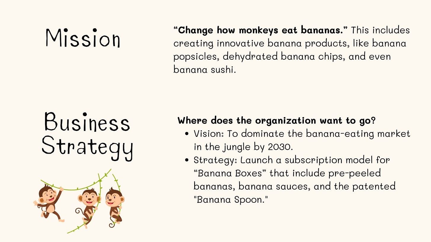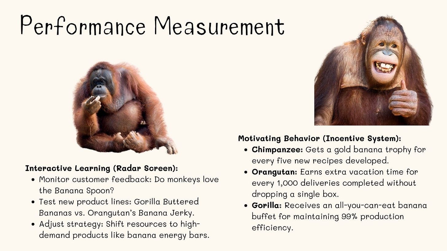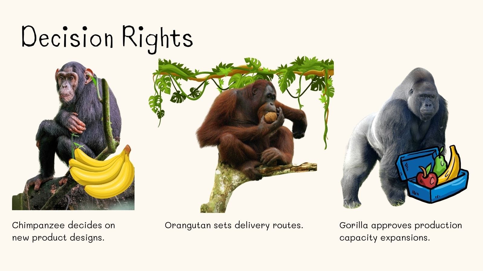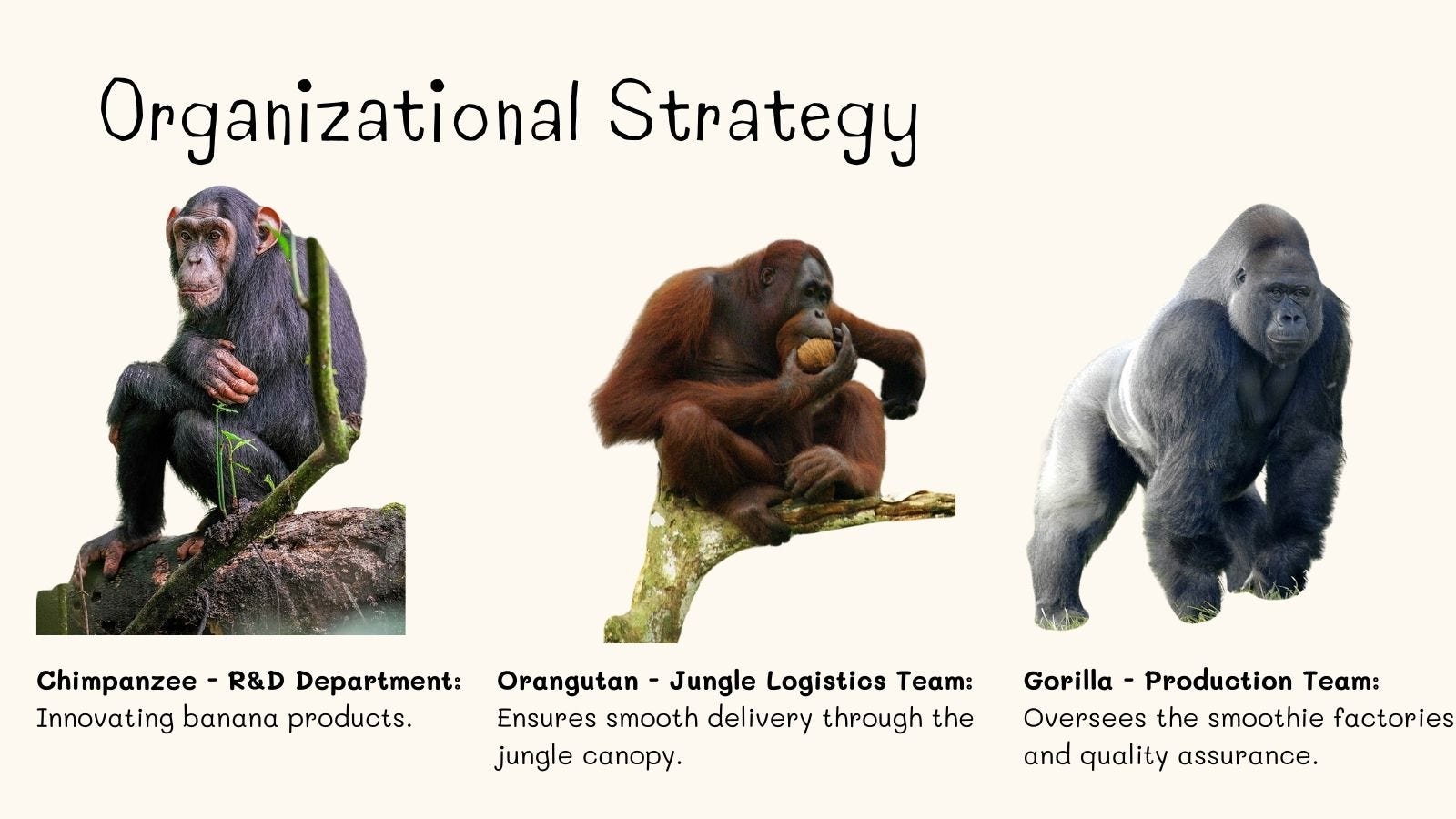Let me share a fun monkey-themed example to make this framework easier to understand! Imagine a monkey-run business aiming to sell bananas throughout the jungle. This company has a few key employees, including a Chimpanzee, an Orangutan, and a Gorilla.