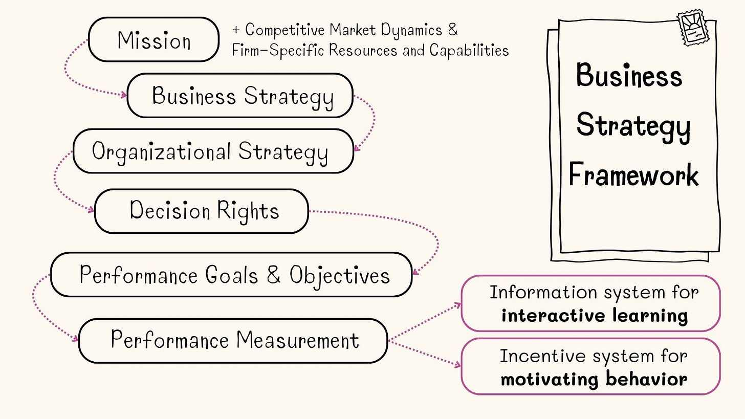 This diagram below illustrates a strategic framework for aligning business strategy, organizational design, and employee’s performance measurement to achieve organizational goals (and adapt to dynamic environments).