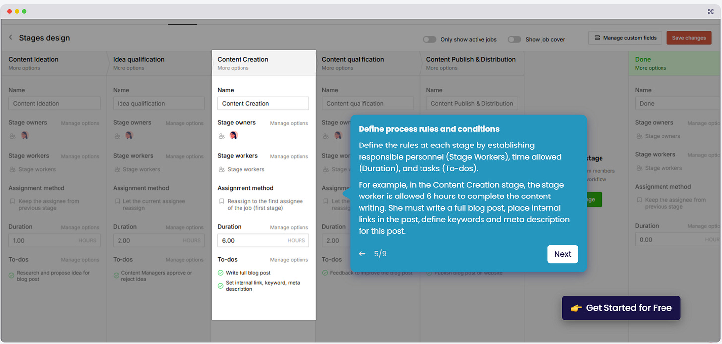 For each process, I define the key stages, the tasks to be completed at each stage (to-dos), the person responsible for each stage (stage workers), the assignment method between stages, and the key outcomes for each stage (custom fields). It's a bit hard to imagine so I created an interactive demo for you.