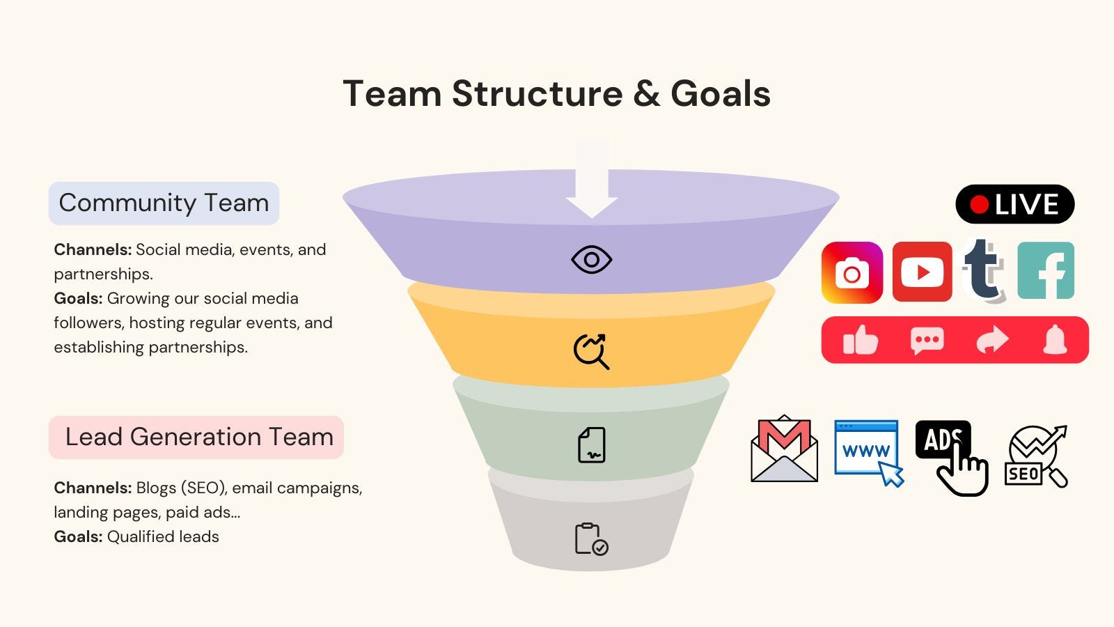 2, Lead Generation Team: This team’s primary role is to attract and convert leads by developing inbound content, building a funnel for each product from awareness to conversion, helping our audience recognize their challenges while positioning our solutions as the answer.