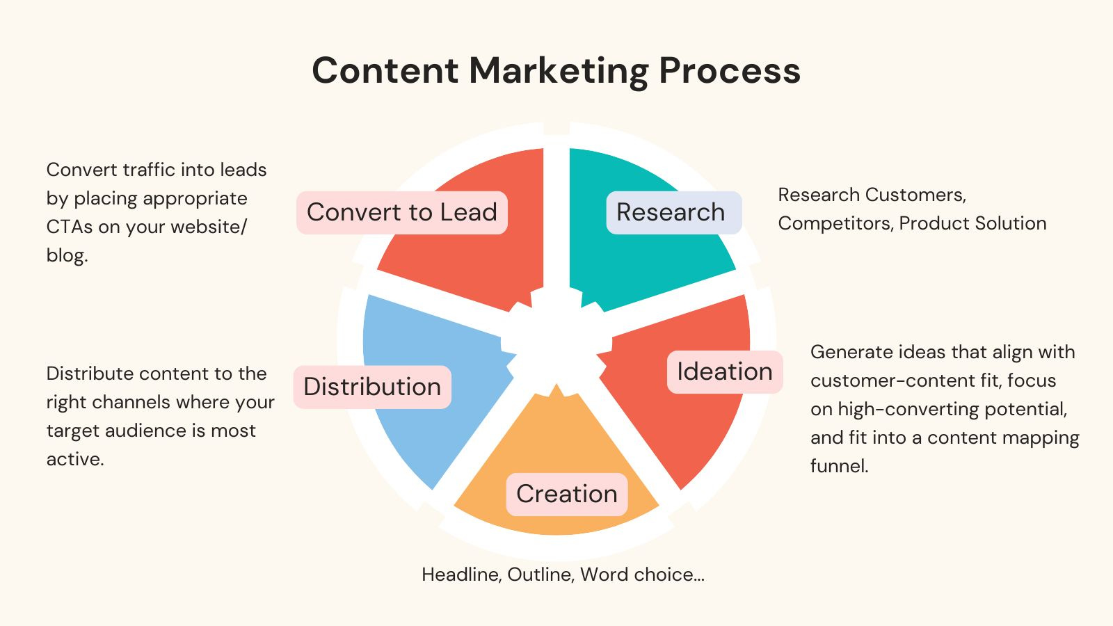 Eighty percent of our workload revolves around content marketing. We leverage content marketing for various purposes: Attracting traffic, nurturing leads, promoting events, encouraging product purchases, and more. To ensure everyone is aligned and maintains a consistent standard of quality, we’ve developed a structured content marketing process. This process is built on six key steps: Research, Ideation, Creation, Distribution, Conversion to Lead, and Measurement.